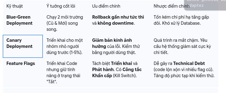 Blue-Green Deployment: Chạy song song hai môi trường Production giống hệt nhau (Blue và Green). Phiên bản mới được triển khai lên môi trường Green trong khi người dùng vẫn đang truy cập môi trường Blue. Khi đã sẵn sàng, lưu lượng truy cập sẽ được chuyển hết sang Green.