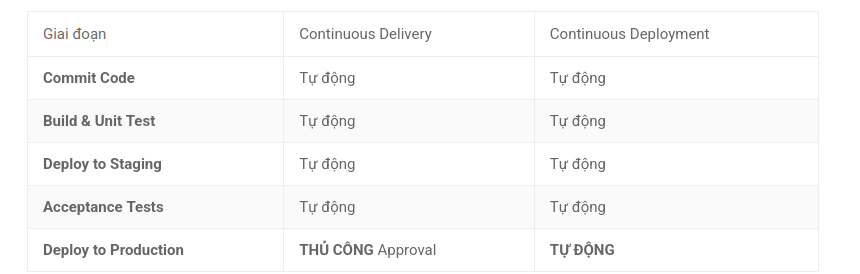 Là bước tiến cao nhất của CI/CD, loại bỏ hoàn toàn “Cổng Phê duyệt Thủ công” của Continuous Delivery. Mọi thay đổi vượt qua được tất cả các giai đoạn kiểm thử tự động sẽ được tự động triển khai thẳng lên môi trường Production mà không cần bất kỳ sự can thiệp nào của con người.